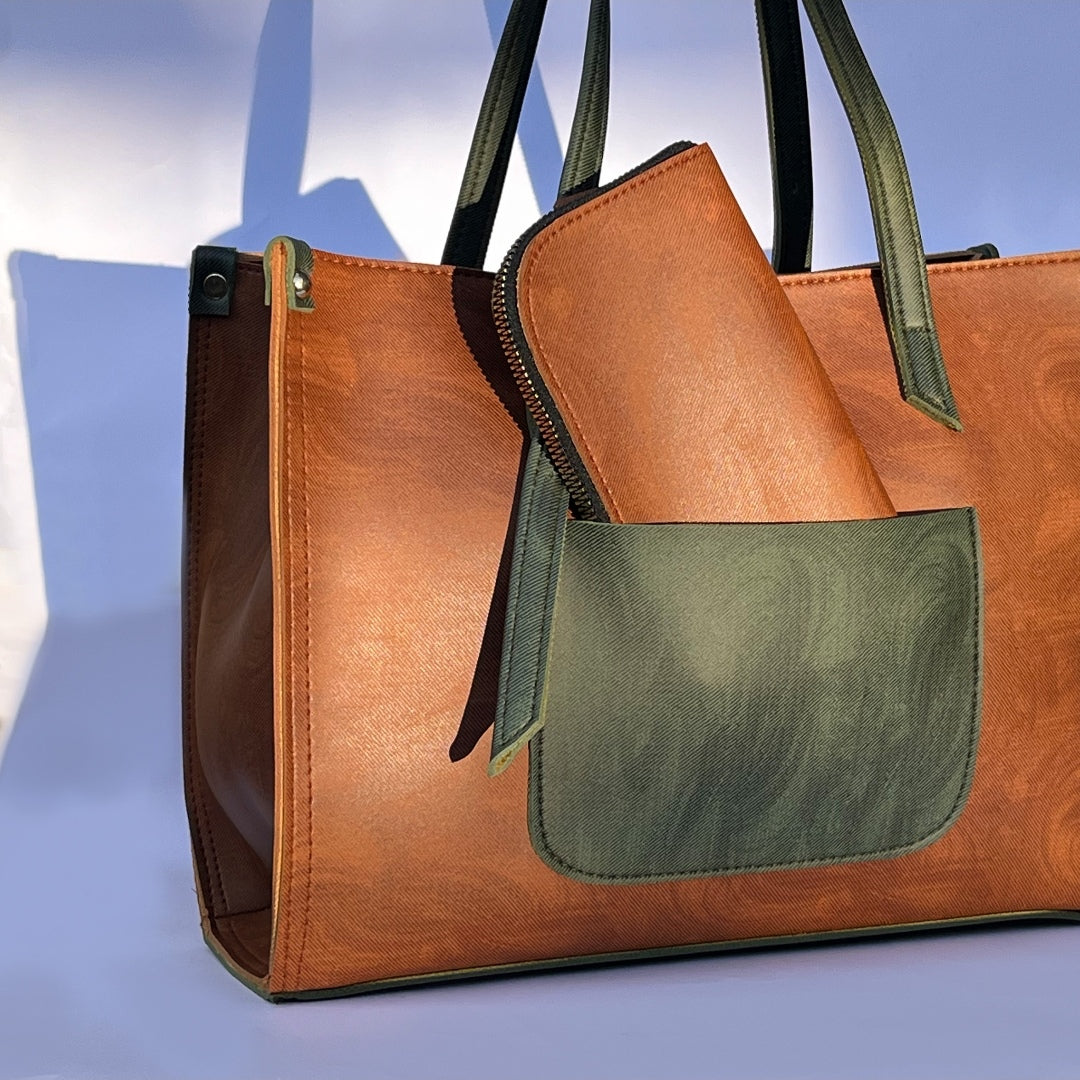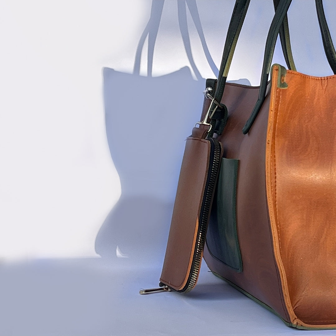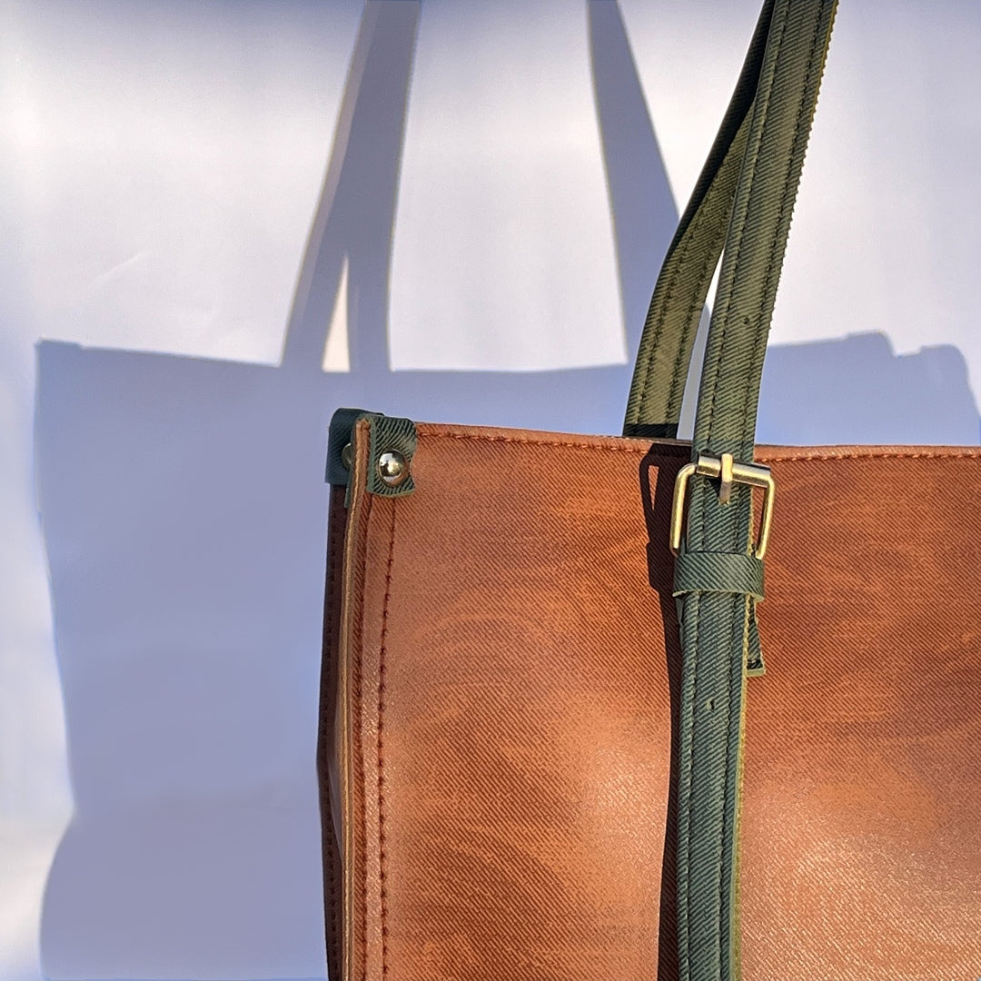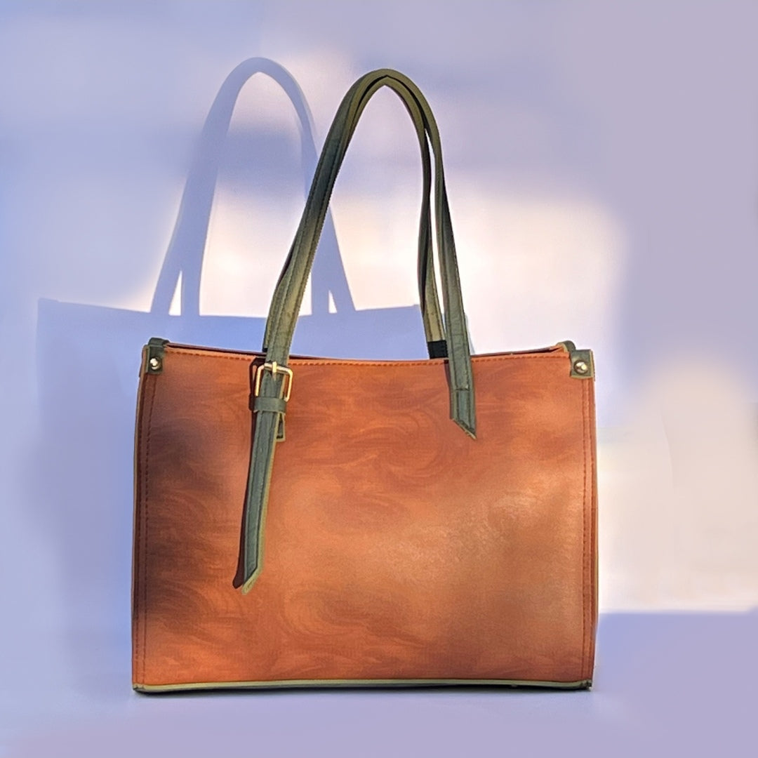 Crafted from premium smooth-grain faux leather, this tote blends durability with timeless style. The structured design holds its shape, while reinforced stitching and sturdy double straps ensure lasting wear. Finished in a rich saddle-brown with deep olive accents, it comes with a matching pouch for added functionality and charm.