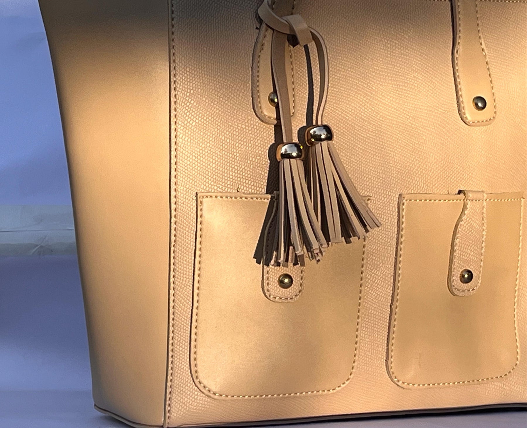 Crafted from high-quality textured faux leather, this tote combines elegance with everyday durability. The structured silhouette retains its shape, while reinforced stitching ensures long-lasting wear. Front pockets add functional style, complemented by twin tassels with gold-tone accents for a chic touch. Lightweight yet sturdy, it’s the perfect blend of fashion and practicality.